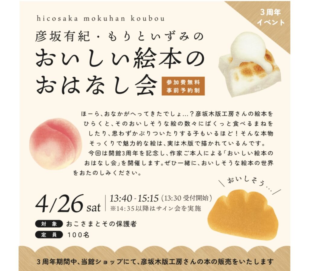 その木版画の実演会もあり、おいしい絵の世界を親子で楽しめそうですね!